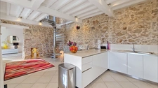 En entrant, on découvre un espace de vie d'environ 50 m² où les tons clairs dominent. A droite, une superbe cuisine moderne et ouverte s'intègre parfaitement dans la salle à manger puis le séjour. On accède depuis toutes ces pièces à une vaste terrasse surélevée bordée de balustres, offrant une vue imprenable sur la mer et idéale pour les repas en extérieur. Une touche d'élégance est apportée par les poutres blanches et les murs en pierre apparentes, créant une atmosphère à la fois authentique et contemporaine. Un WC invités est également disponible à ce niveau.